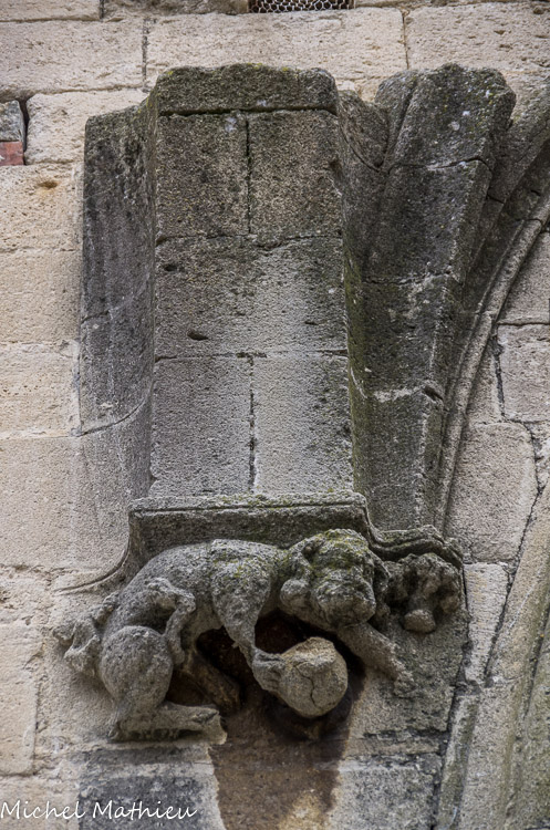Les amorces d'un porche jamais construit (les voussoirs) sont ornées de personnages fantastiques.