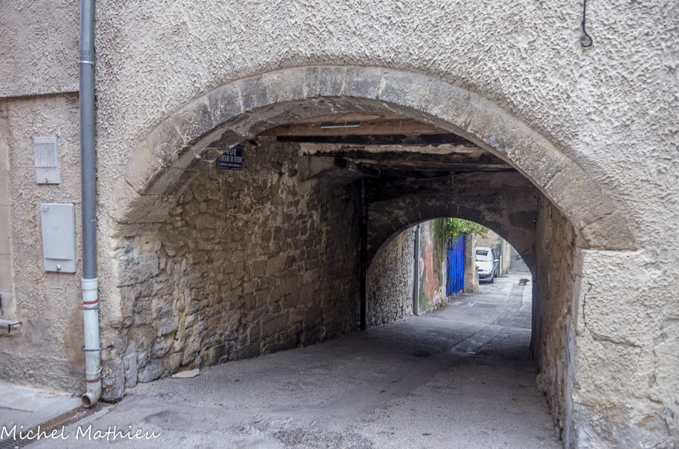 Malaucène. La porte du téron. Le "soustet" situé en face de la fontaine ouvre sur la rue qui conduit à la porte du Téron et, au-delà, à la source et au monastère du Groseau. Cette porte, pour des raisons de sécurité, resta le plus souvent fermée ; elle ne fut ouverte définitivement qu'en 1789. Les soustets. Leur fonction d'abri (contre les grosses chaleurs ou la pluie) est évidente : c'est d'ailleurs ce qu'exprime le mot provençal sostet (se metre a la sosta : se mettre à l'abri). Mais leur première raison d'être est liée aux nécessités d'urbanisme de ce qu'on appelle l'habitat groupé : en effet, dans ce type de structure, où les maisons sont serrées à l'intérieur de remparts tout autour d'une éminence, le soustet permet de gagner de la place et de consolider l'ensemble.